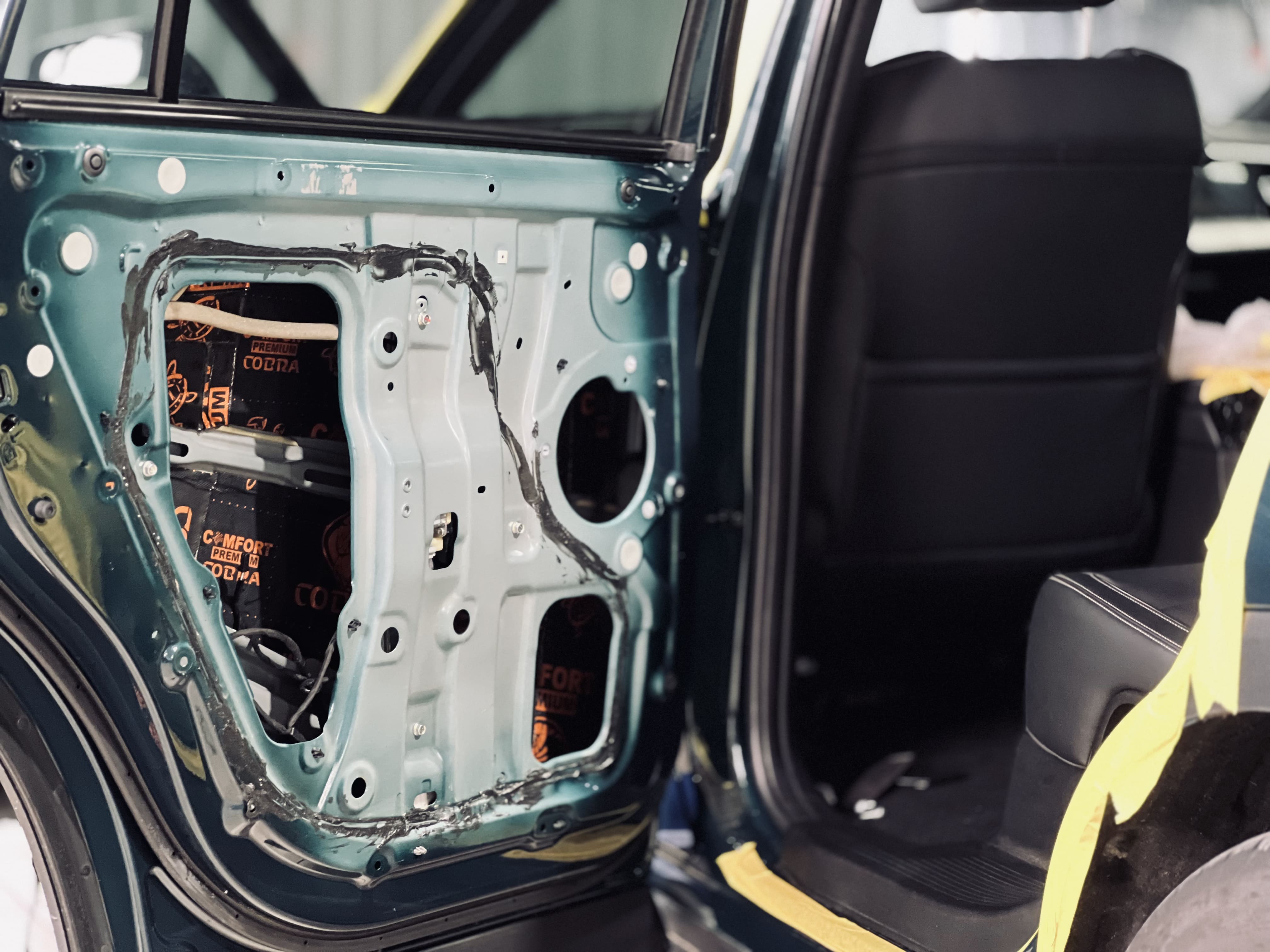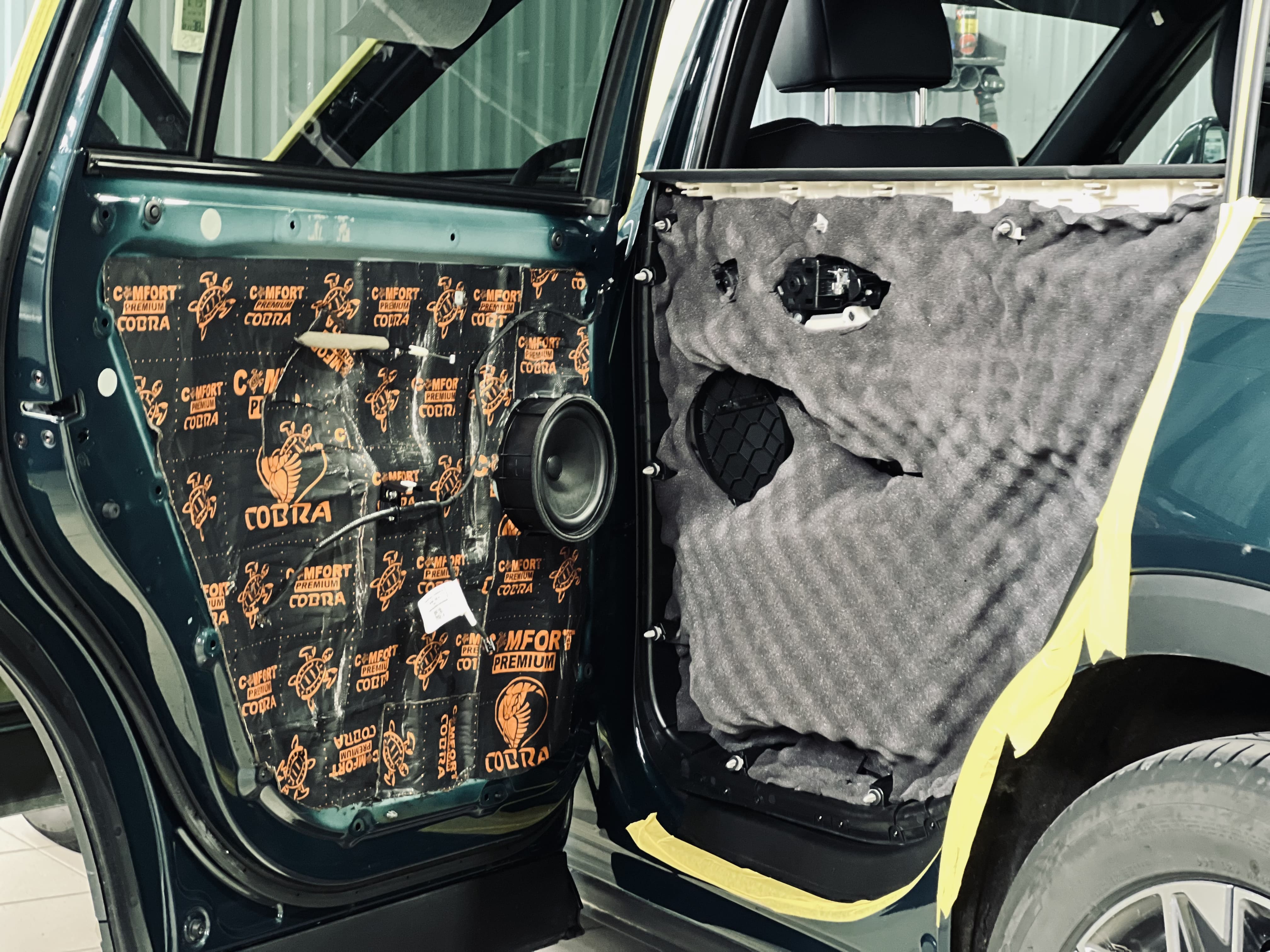Работа началась с нанесения первого слоя виброизоляции Comfort Mat Dark Cobra на двери. На снимке показан процесс наклейки Dark Cobra на дверь, выполненный с высокой точностью.
