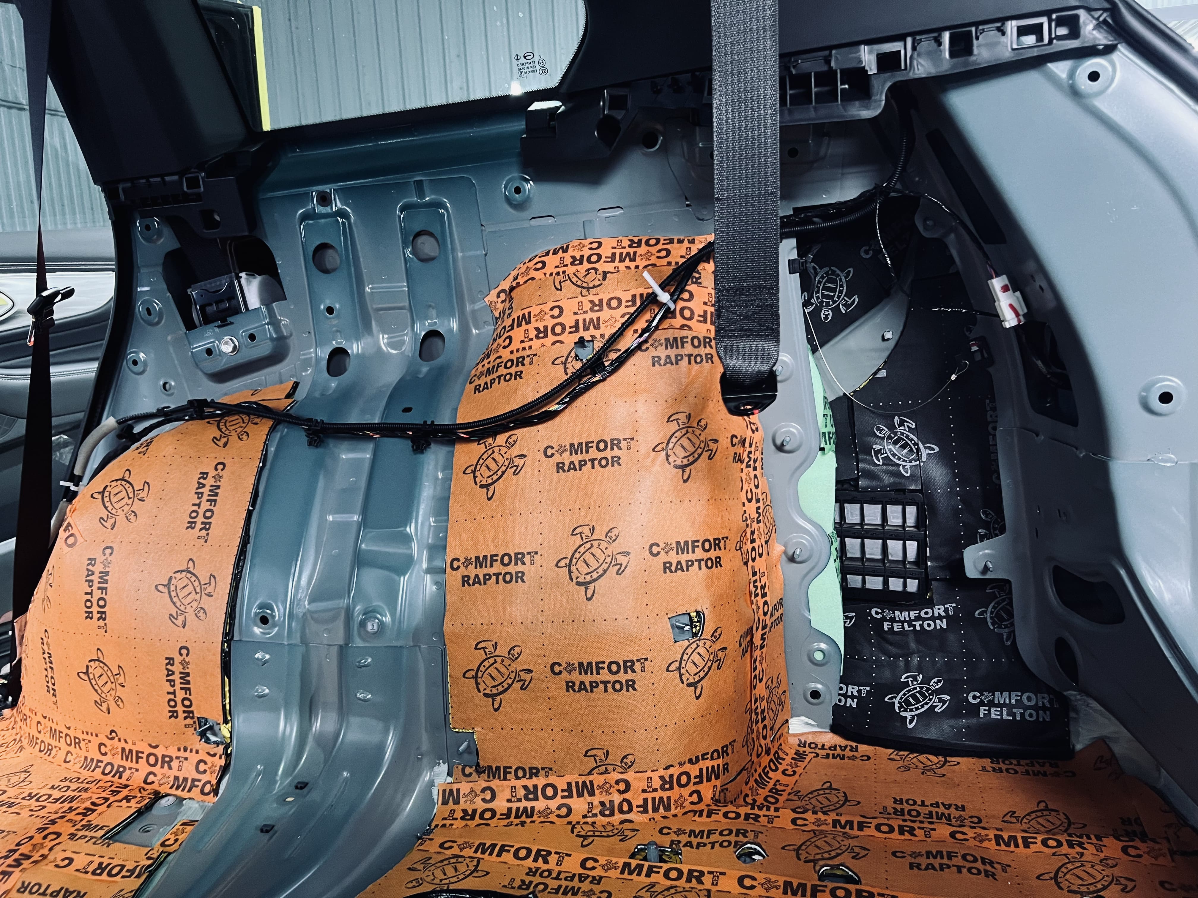 Вторым слоем применили комбинацию материалов: под передние пассажирские сиденья – Comfort Mat Premium BlockShot, в остальных зонах салона, на дне багажника и выступающих частях над колесными арками – Comfort Mat Raptor, а на стенки багажника – Comfort Mat Felton и мягкие, шумопоглощающие блоки Comfort Mat Soundtrap Green. Для закрытия швов и стыков мы использовали контурную ленту, подобранную в тон шумоизоляции, что не только повышает надежность, но и придает эстетичный вид, даже скрытый под ковровым покрытием.